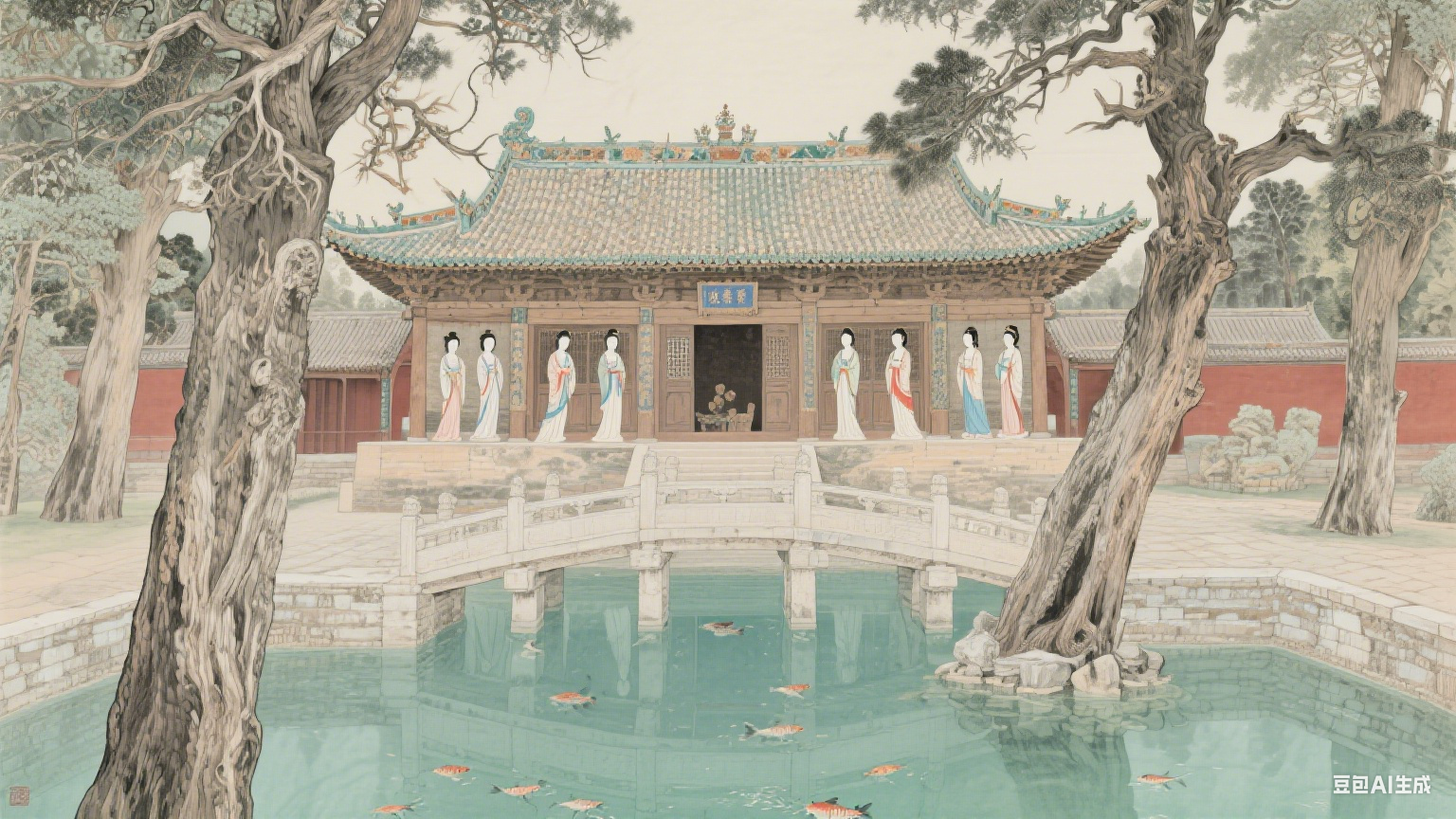 (晋祠圣母殿全景图,宋代木构殿宇飞檐翘角,殿前鱼沼飞梁横跨碧水,侍女像分列两侧,古柏掩映间尽显 “晋祠三绝” 的雅致)