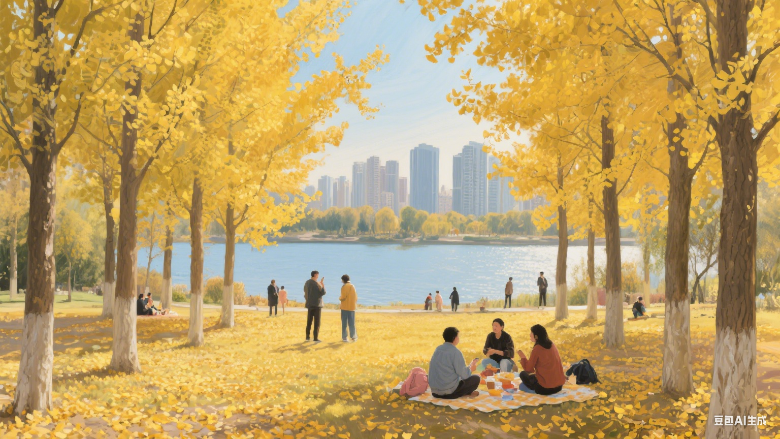 (汾河公园秋日景观,银杏林金黄一片,市民在林间散步、野餐,远处的汾河碧水与城市楼宇相映,尽显生态之美)