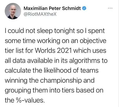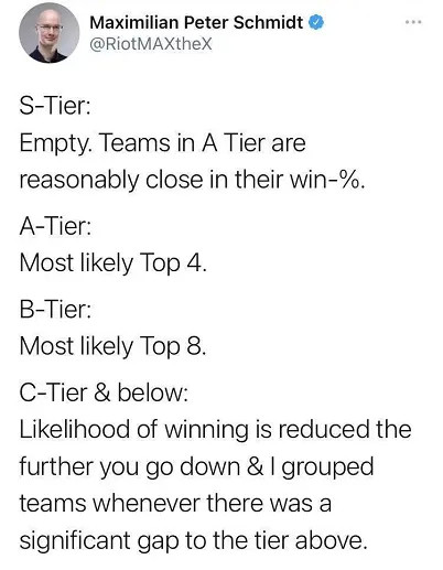 今晚我无法入睡,所以我花了一些时间制定了2021年世界赛的客观实力排名,该排名使用了一些数据来计算队伍赢得冠军的可能性,并根据百分值将他们分组。