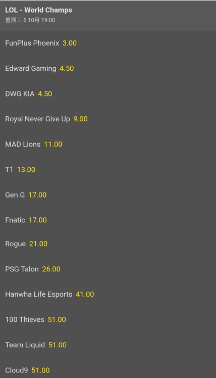 自从参加S11世界赛的22个队伍确定之后,各大赛区的圈内人士都给出了他们的预测,不过因为赛区偏向性的缘故,这些东西大家看看就好,哪个赛区的观众都希望自家队伍夺冠,所以真要看预测的话还是要从外围机构入手,他们可不会因为哪个队伍人气高就偏向哪个队,他们是以赚钱为目的的组织,国内这边因为之前的严打导致很多机构都销声匿迹了,毕竟Bo假赛事件当时闹得挺大,但是外国那边丝毫不受影响,并且他们还给出了夺冠指数,说白了就是赔率。